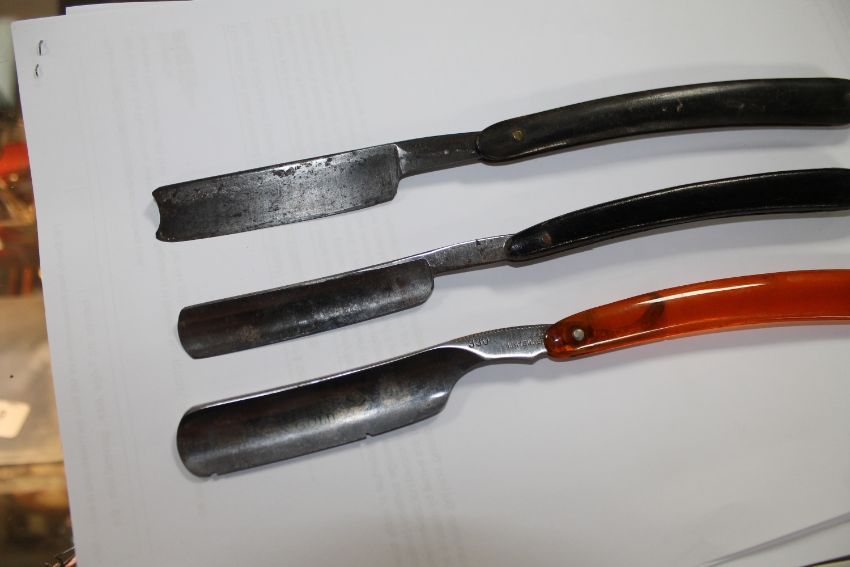 A tray of fine silver pocket watch and one other, a small collection of pen knives, Special Constable badge, Police badges, cut throat razors, pens etc