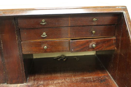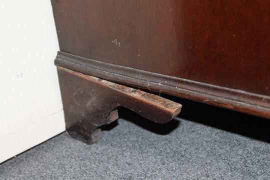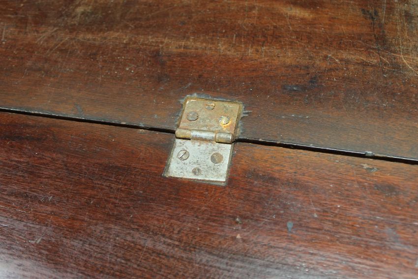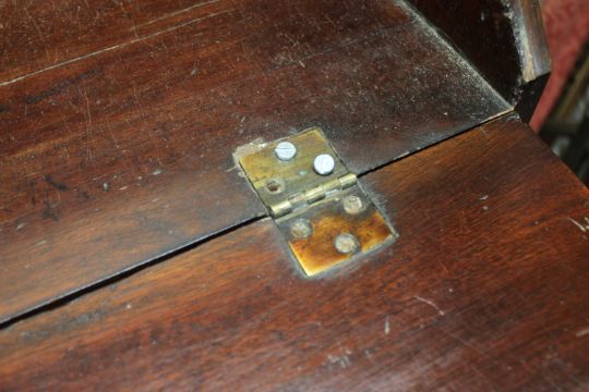 Interior hinges and screws replaced. Back left leg unstable, two loose pieces present in drawer. Some escutcheons missing. Typical minor scuffs and scratches. Fine natural split to right side.