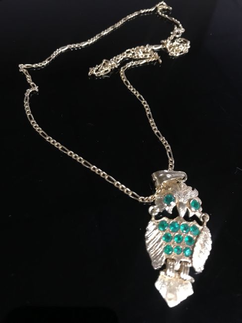 An 18ct owl pendant set with emerald and chain. 12.8grams