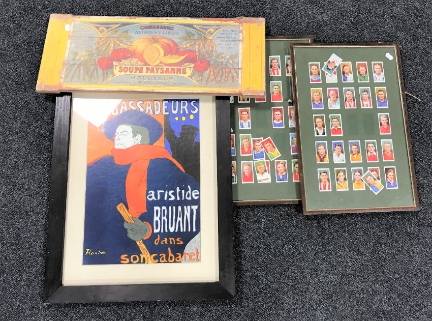 A French Soupe Paysanne advertisement on board, framed cigarette cards, Ambassadeurs picture