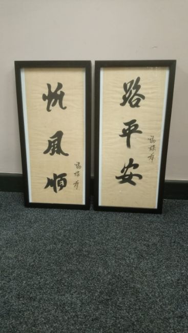 A pair of early 20th century Chinese calligraphy panels, with red seal mark, 49 cm x 22 cm (2)