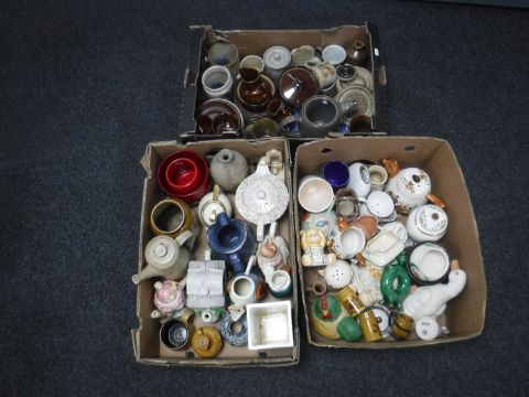 Three boxes of assorted china, glazed stone pots, Denby teapot etc