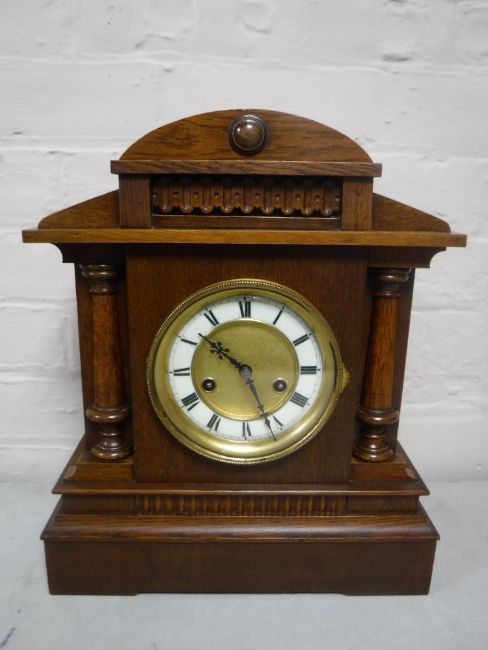 An Edwardian oak bracket clock with pendulum and key