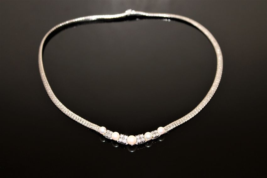 An 18ct white gold necklace set with pearls and diamonds, approximately 0.9ct. 28.9 grams