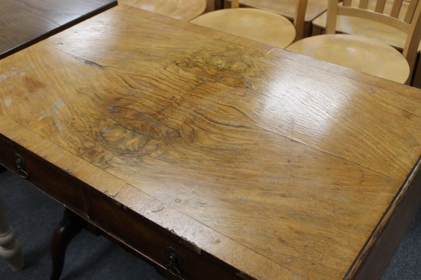 Veneer lifting and numerous minor veneer losses. Frame rather wobbly. 92cm wide by 57cm deep by 74cm high. Each leaf when upright would add 26cm in width.