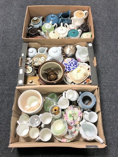 Three boxes of assorted china, boxed china teapots by Denby, oven dishes, mugs etc