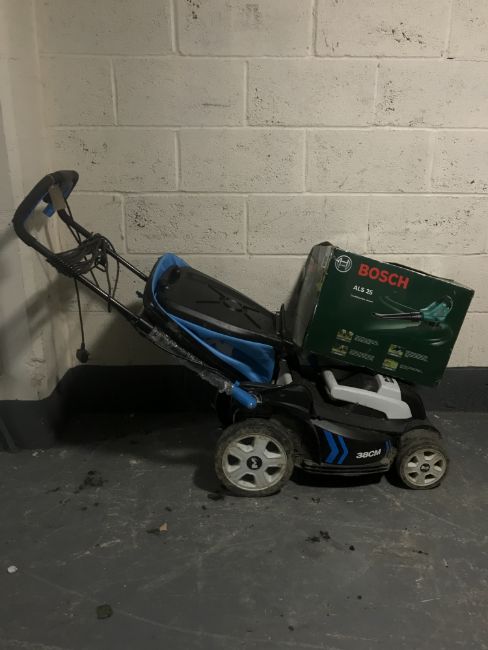 A boxed Bosch garden vac and a MacAllister electric mower