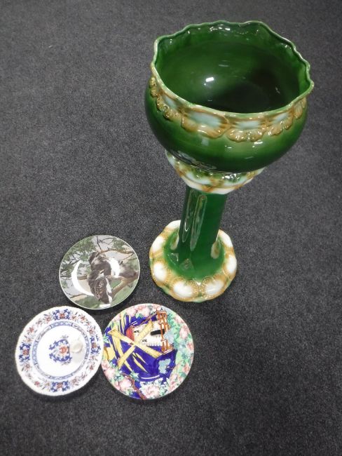 An English pottery jardiniere on stand and a miniature Imari style tankard, Maling windmill wall plaque, Royal Doulton Young Kookaburras plate and one other