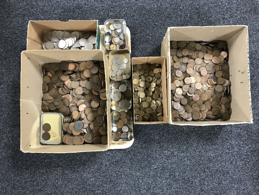 A substantial quantity of British One Penny coins (8.7 kg approximately), together with a substantial quantity of British Half Penny coins (approximately 6.8 kg), a substantial quantity of British Three Pence coins (approximately 3.1 kg), one hundred and twenty British Half Crown coins, twenty seven British Six Pence coins (contained in a Golden Virginia Tobacco tin) and approximately one hundred and fifty miscellaneous coins (mainly foreign and contained in three Golden Virginia Tobacco tins). (Q)