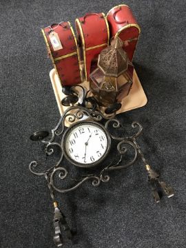 A tray of glass lantern, metal wine boxes, metal clock with candle prickets etc