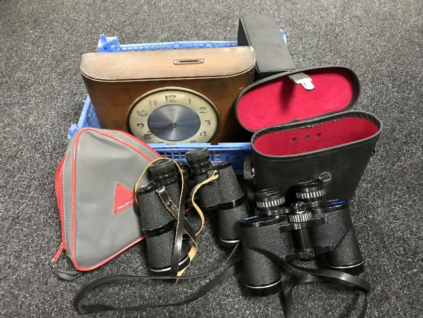 A basket containing early 20th century mantel clock, two pairs of binoculars etc