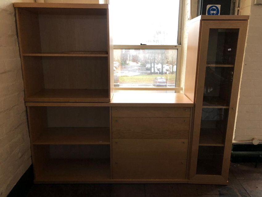 A three section beech storage unit fitted with drawers