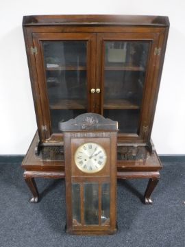A pine double door glazed cabinet, low coffee table and an Edwardian wall clock
