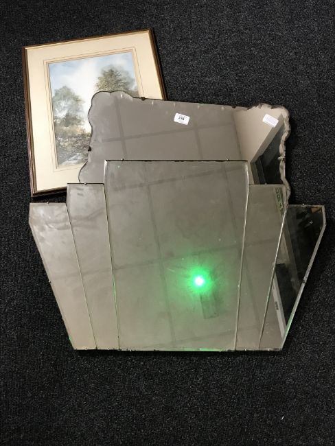 Two Art Deco frameless mirrors together with a colour print depicting woodland