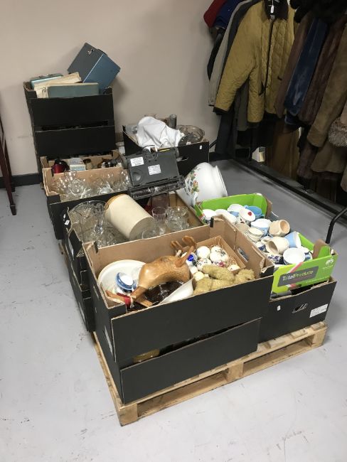 Two pallets containing a large quantity of china and glass, ornaments, Port Merion vase, crystal etc. (Q)