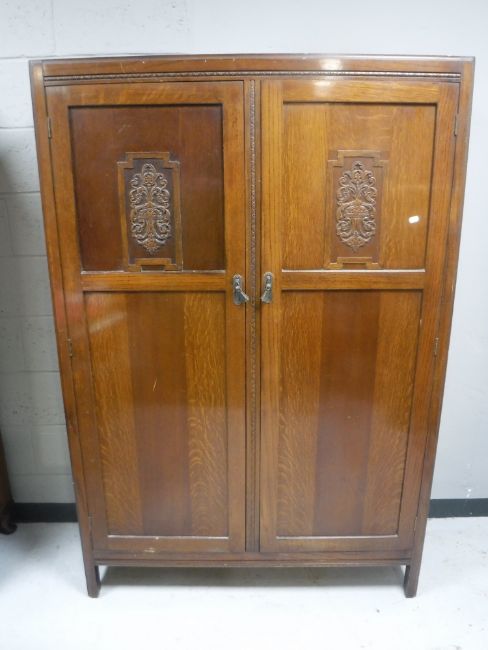 An oak double door wardrobe together with storage drawers