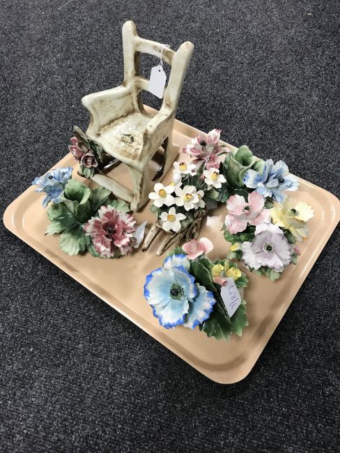 A Capo Di Monte ceramic model : Rocking chair with roses, height 21 cm, together with a pair of floral candlesticks, a wheelbarrow with flowers and two further ornaments modelled as flowers in planters. (6)
