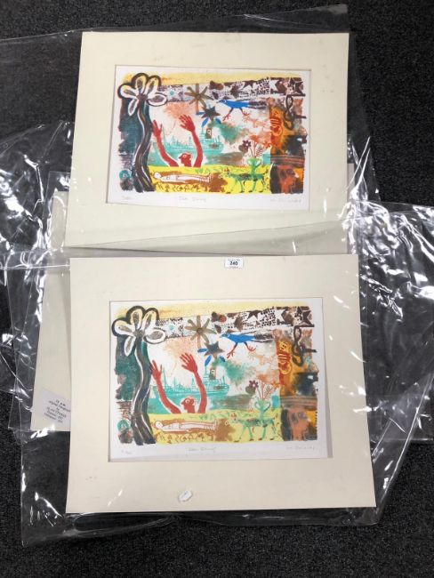 M. Shields : Sea Song, lithograph in colours, numbered 5/30, signed in pencil, 32 cm x 44 cm, together with a multiple of the same print and numbered 10/30, two signed screenprints by Marie Wright, two signed screenprints by Mark Wilson, two signed etchings by Paul Rogers, an indistinctly signed etching and aquatint titled "The Pianomovers thank The Angel", a signed lithograph by Alan Stones and an unsigned screenprint by Shirley Neil, all parts unframed. (11)
