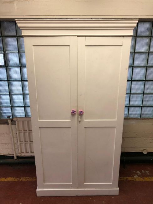 An antique painted white double door cabinet