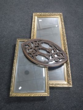 Two gilt framed mirrors together with Gothic style hardwood framed mirror