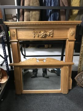 A light pine carved fire surround with mirror