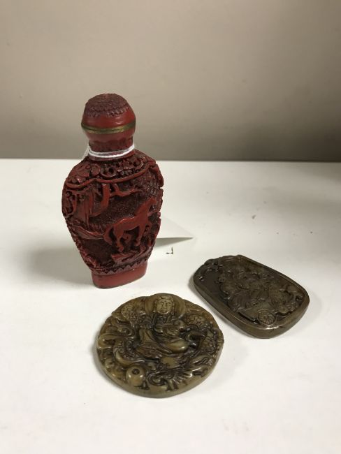 A Chinese cinnabar scent bottle and two carved soapstone pendants