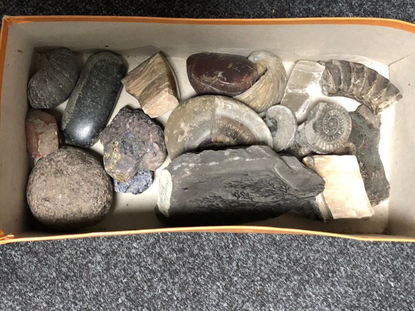 A box of fossils and polished stones