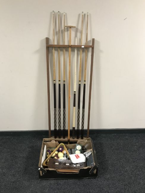 A snooker cue rack containing six two-piece cues and a rest, together with a box of pool balls, triangle, score board etc