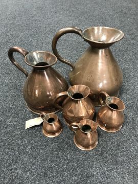 A graduated set of six copper jugs