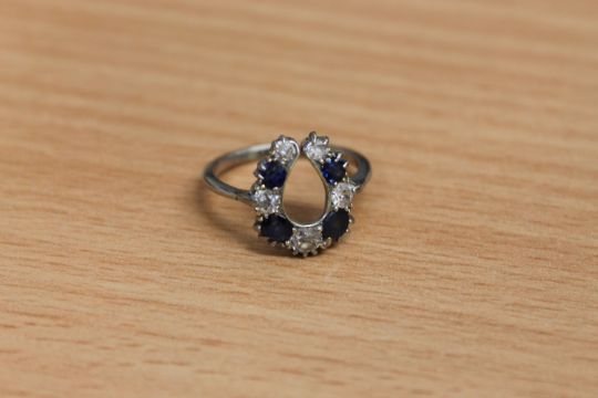 The largest central diamond weighs approximately 0.181 carat. The total diamond weight is approximately 0.42 carat. The lower-right blue stone would appear to be a paste replacement. All of the stones are old cuts apart from the paste stone which is a brilliant cut. The ring weighs 2.9g. Circa 1900.