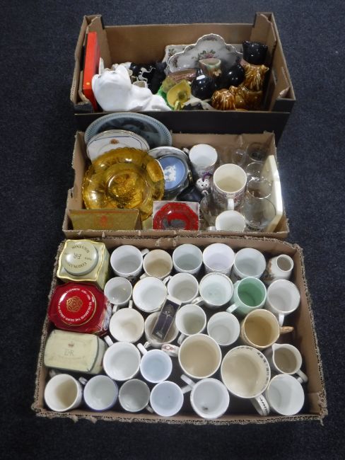 Three boxes of commemorative china and tins, cutlery, cat ornaments, Hornsea vase etc