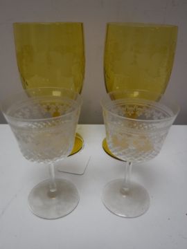 Two 19th century etched yellow glass goblets together with two liqueur glasses