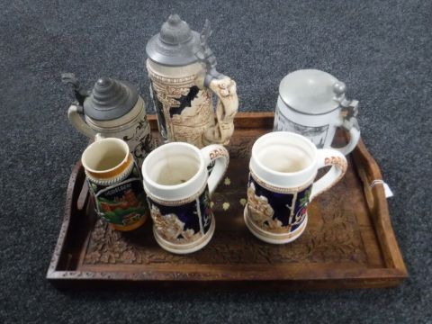 An Eastern carved serving tray together with a quantity of German pottery tankards and beer steins
