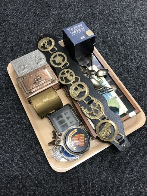 A tray of trinket boxes, RAC and Northumberland car badge, horse brasses, small display case of Wade Whimsies etc
