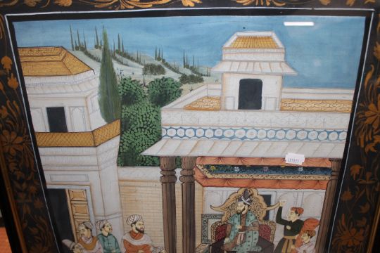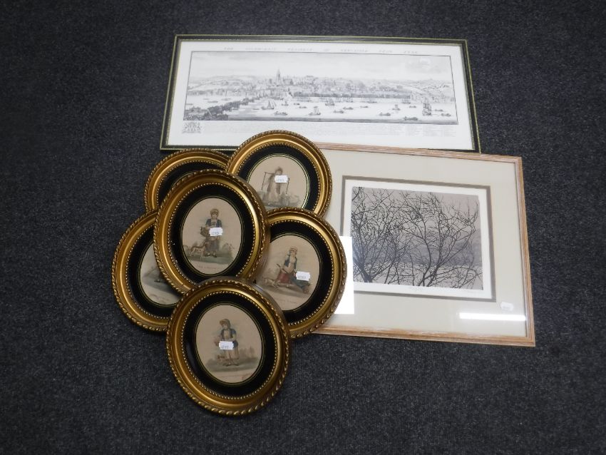 A framed Indian watercolour, box of six 19th century hand coloured engravings, print of Newcastle and a signed print