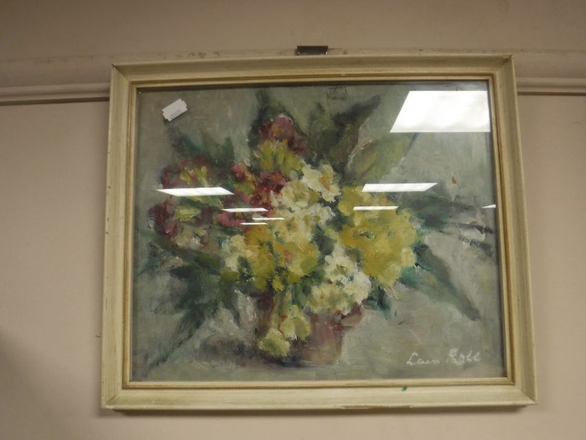 Lena Robb : Still life with flowers in a vase, oil on board, signed, framed.