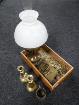 A pair of brass candlesticks, brass oil lamp, horse brasses etc