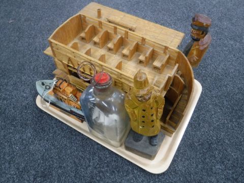 A tray of two hand built folk art models of a traction engine and an open top bus, together with a wooden model of life boat, a ship in bottle and two carved wooden figures - Fishermen