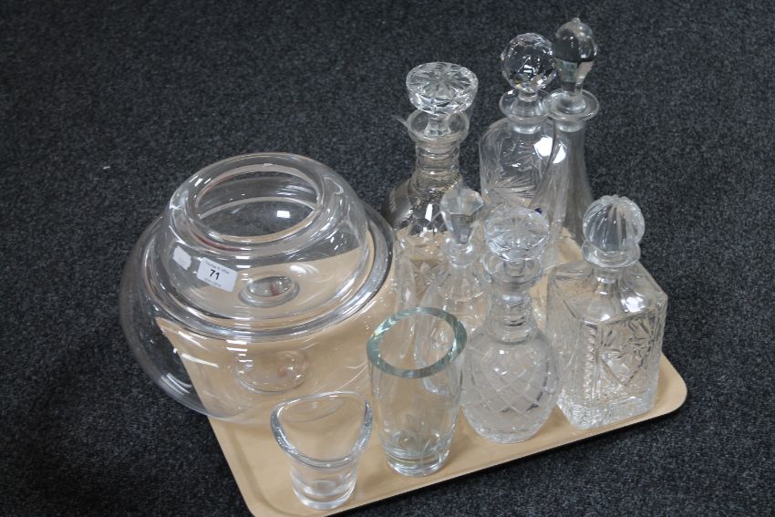 A tray of six continental glass decanters with stoppers together with two graduated glass bowls and two vases