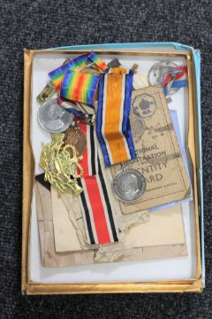 A box containing military items including two WWI medals presented to 36506 PTE. E. BURTON. LEIC. R. together with his National Registration identify card, together with cap badges and a special constable badge with ribbon