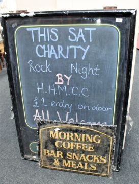 A metal folding two way pub chalk board together with a hand painted metal sign