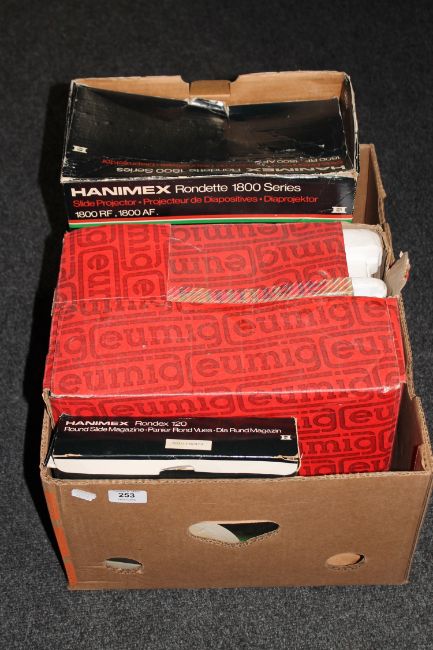 A box containing a Eumig projector together with a Hanimex projector and a Hanimex slide magazine