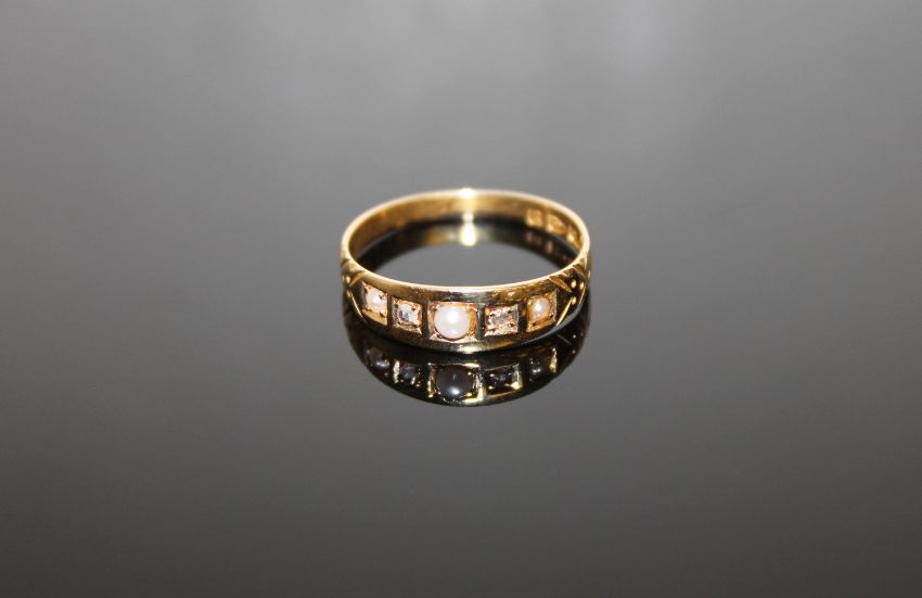 An 18ct gold pearl and diamond ring, size P, 2.3g.