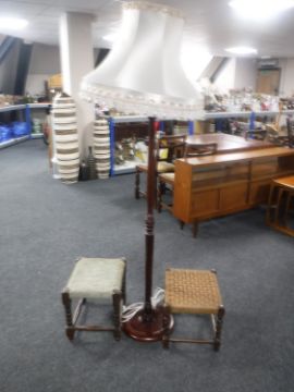 A mahogany standard lamp with shade together with two oak footstools