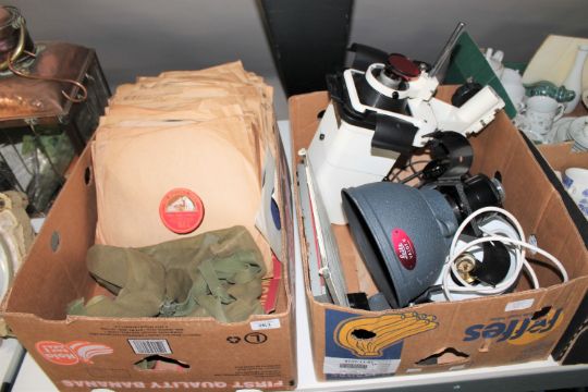 Two boxes containing vintage satchel, 78's, ME Opta Opemus 5, Leitz lamp etc