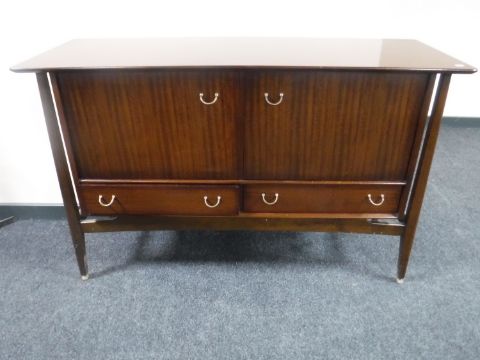 A mid 20th century teak G Plan sideboard and table together with a set of six green buttoned leather dining chairs comprising two carvers and four singles