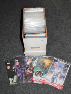 A box containing 21st century comics and graphic novels including Kick Ass, Captain America, Avenger etc