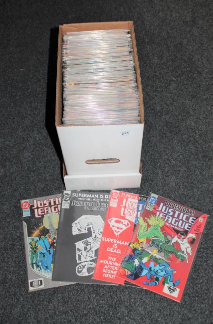 A box containing late 20th century DC comics including Justice League, The Weird etc