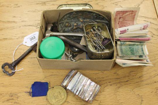 An interesting box of collectables including antique key, bank notes, coins, yellow metal chain etc.