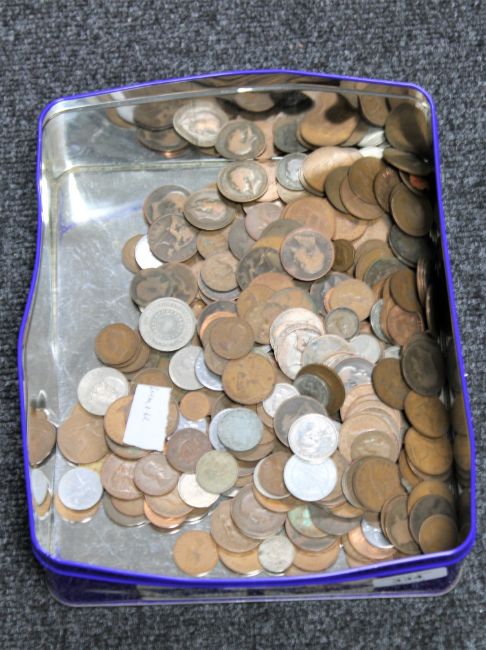 A tin of a quantity of pre-decimal British coinage, foreign coins etc